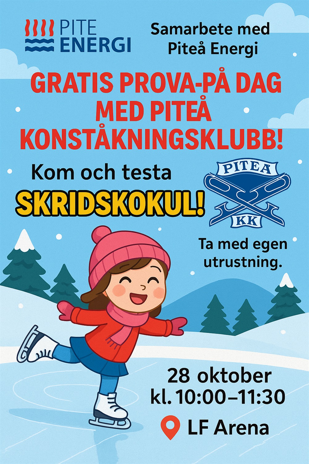 Under höstlovet kan vi i samarbete med Piteå energi erbjuda rolig träning tillsammans med våra tävlingsåkare. Kom och prova på och ta med en kompis! Vi tränar, leker och åker fritt! Välkomna! Tiden är 10:00-11:45, dropp in, kom när det passar.