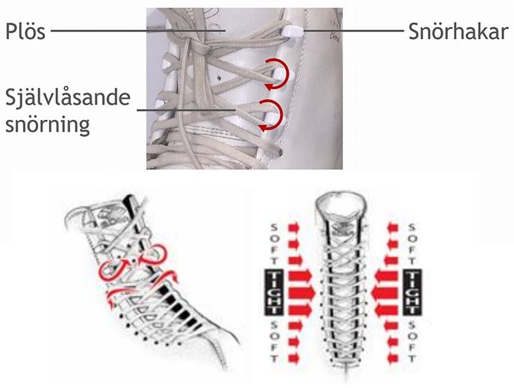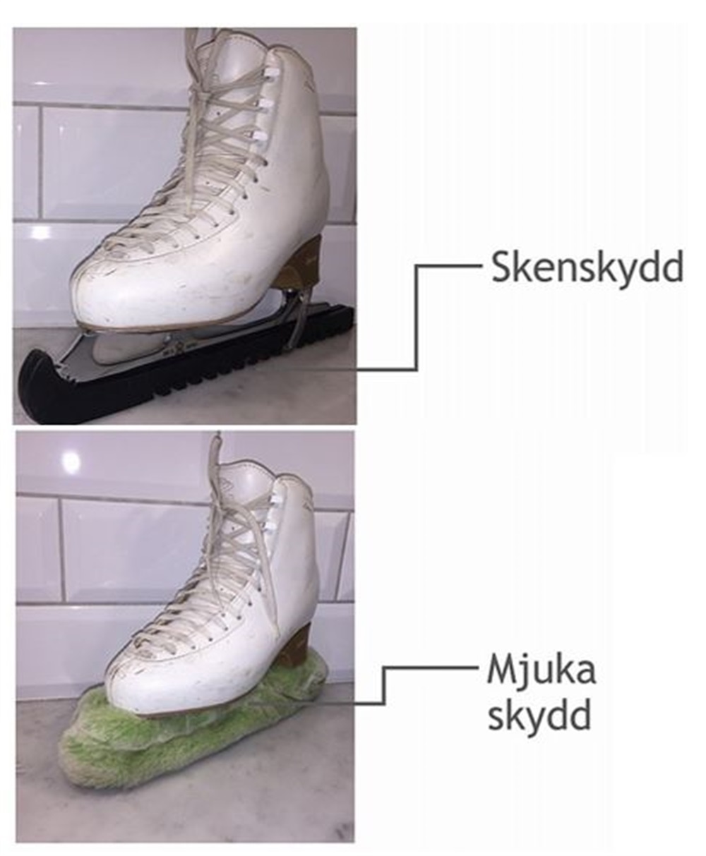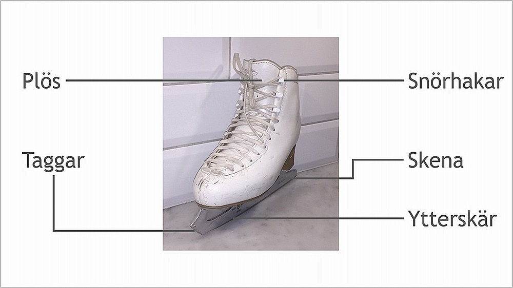 Figuren visar en modern tävlingsskridsko med en avancerad tävlingsskena. Det är viktigt att vårda skridskon och skenan för att få ut det mesta av träningen. Ett par tävlingsskridskor kostar mellan tre- och femtontusen kronor, också en anledningen att vårda dem. Skenan har en inner- och en ytterkant med en lite dal mellan dem, den så kallade skålen. Dra försiktigt med fingret längs skenans underdel för att känna efter om skenan behöver slipas. Om kanterna har många små hack eller om de känns slöa bör man slipa omedelbart. Som tumregel räcker en slipning runt 20 timmars åkning, om man är rädd om skenorna. Det är klokt att hålla kanterna slipade, då man annars alltid får en anpassningsperiod från att åka på slöa kanter till skarpa kanter. Om kanterna hålls skarpa slösar man inte bort värdefull träningstid på anpassning. Och skarpa kanter behövs för att få ut maximalt av åkningen. När man åker på en kant säger man att man åker på inner- eller ytterskär, se figur 1. Vid saxning i hög fart åker man ytterskär på inner skridskon och innerskär på den yttre skridskon, den som man överstegar med. Nybörjare tenderar att hålla skridskorna brett isär och åka innerskär på båda skridskorna (förr kallades detta att "åka på lädret").