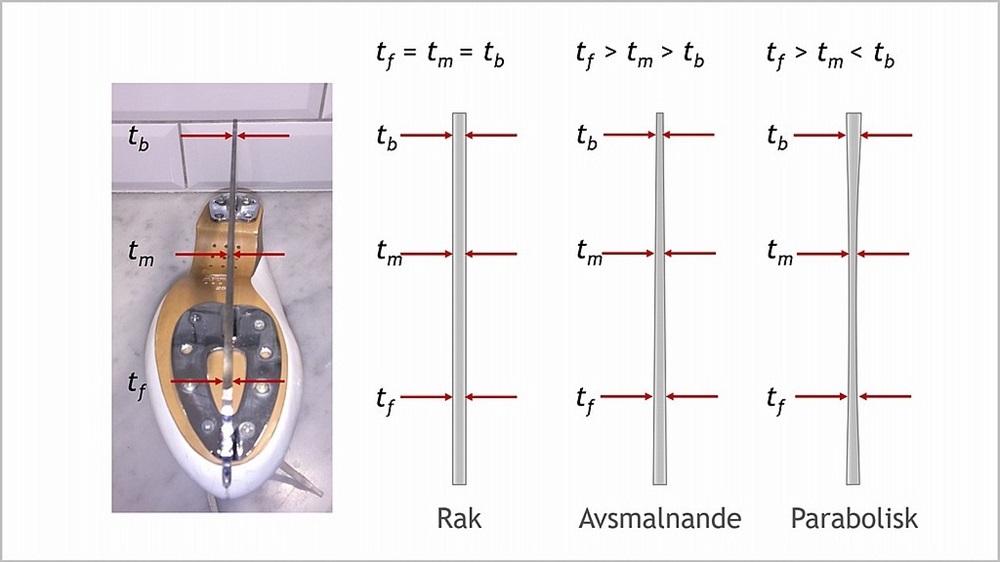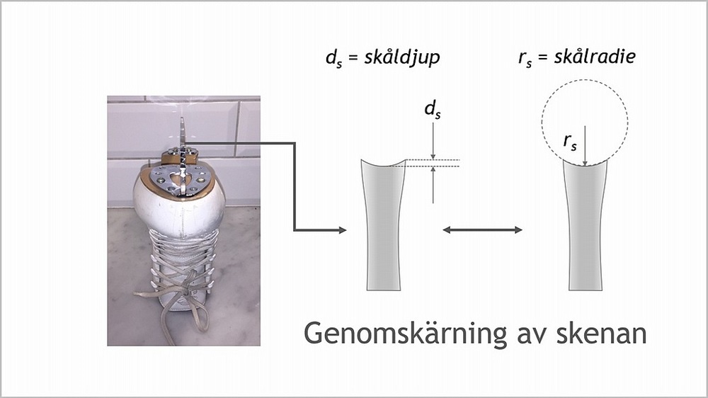 Figuren visar en vertikal genomskärning av skenan, tex vid mitten längs skenans längd. Genomskärningen är vinkelrätt mot åkytan. Slipningen ger en inner- och en ytterkant. Hur djupt kanterna kommer att tränga in i isen avgörs av skåldjupet, se bilden. Skåldjupet bestäms av skålradien och tjockleken på skenan. Skåldjupet ökar med minskande skålradie. En lätt åkare bör ha ett större skåldjup än en tyngre åkare. Det ger den lättare åkaren bra grepp vid åkningen. En ung, lätt åkare kan ha en skålradie på 11 mm. En tung åkare tränger ner för djupt in i isen om skåldjupet är för stort, vilket bromsar upp åkaren och hindrar flytet i åkningen. En tyngre åkare kan ha en skålradie på upp till 19 mm.